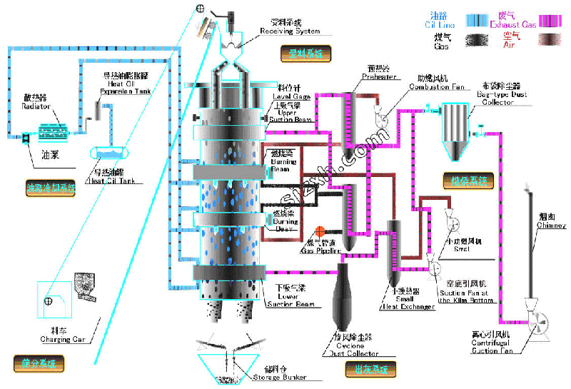 4、采用雙向壓力系統(tǒng)是該窯的另一重要特點(diǎn),二次空氣用小鼓風(fēng)機(jī)鼓入,通過(guò)特殊形狀的分布梁進(jìn)入冷卻區(qū),均勻地冷卻石灰,使窯內(nèi)自煅燒區(qū)以下保持正壓,這較全負(fù)壓系統(tǒng)更易于精確控制一次、二次空氣量。窯上部的廢氣則采用可調(diào)節(jié)的引風(fēng)機(jī)抽出,使窯內(nèi)煅燒區(qū)以上保持負(fù)壓,使窯截面上加熱溫度均勻。風(fēng)量調(diào)節(jié)范圍從10%-100%,通過(guò)調(diào)節(jié)平衡所需的燃燒空氣量,使窯能在最佳的操作條件下工作,從而保證燃燒良好,熱耗降低,同時(shí)減少動(dòng)力消耗,降低生產(chǎn)成本。